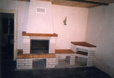 Použitý materiál: tvárnice HEBEL, izolačný materiál super izol, šamotová tehla C - 25, 12 kw krbová liatinová vložka , vetracia mriežka, drevené doplnky, teplovzdušné rozvody do vedľajších miestnosti a na poschodie.